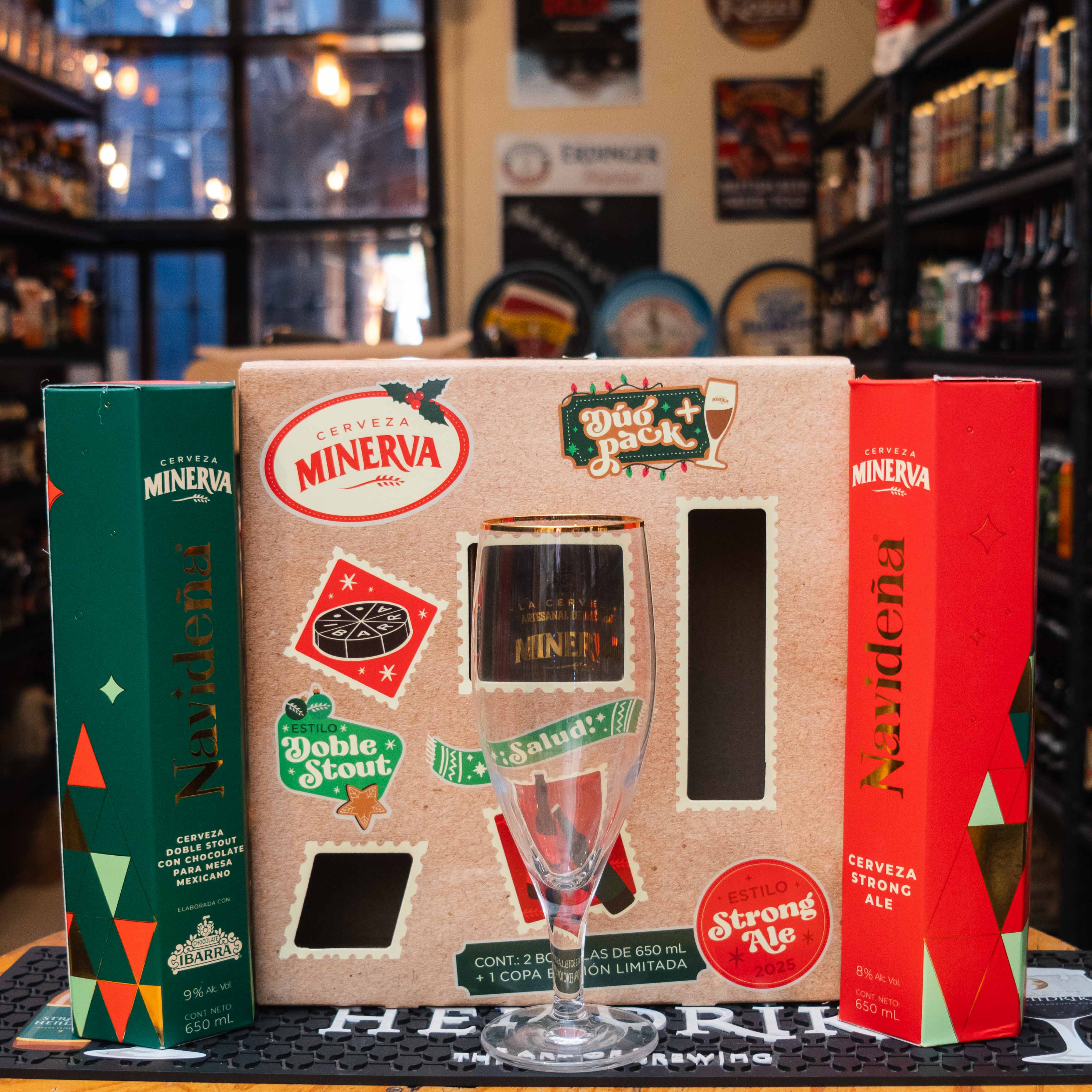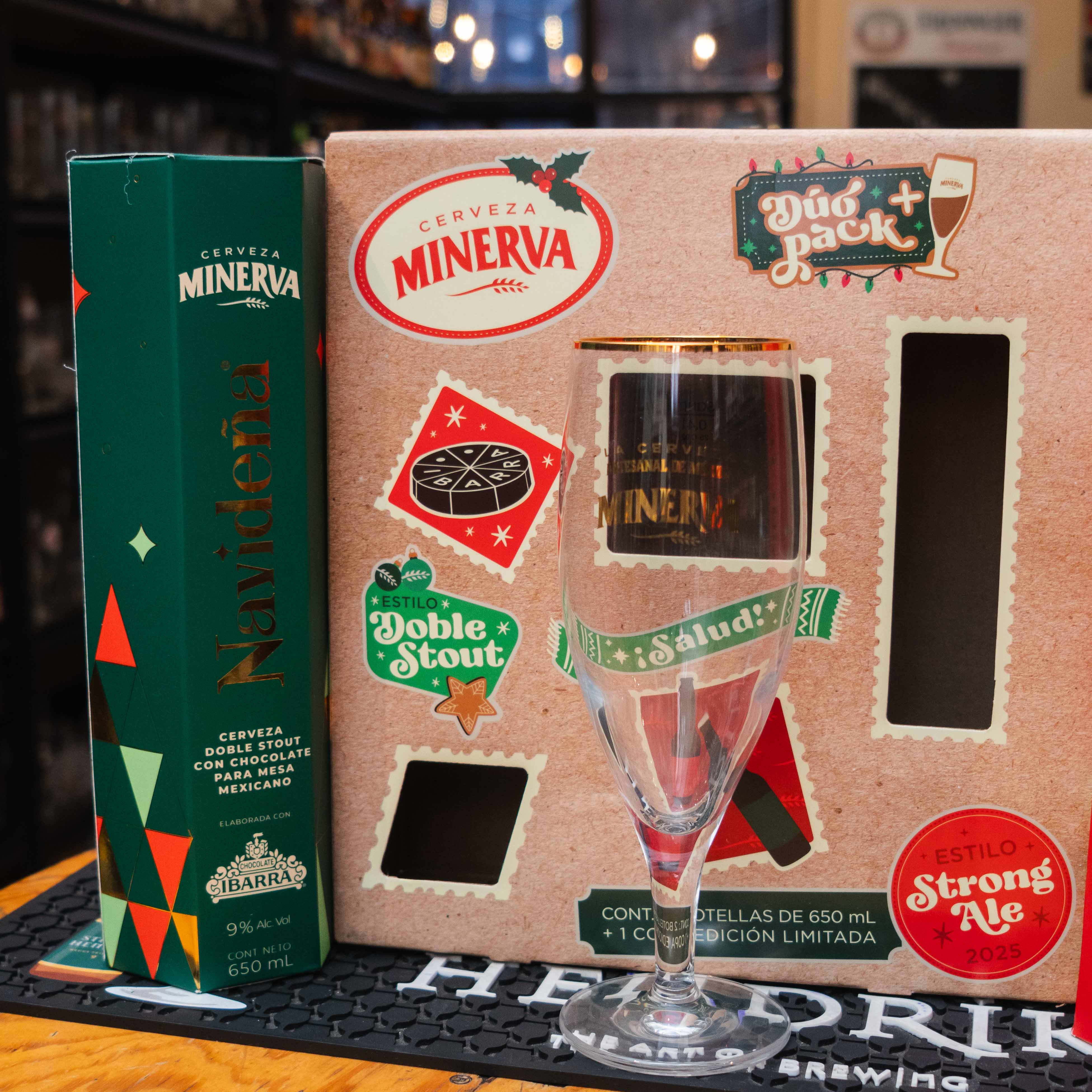 El Pack Navideño Minerva (Dúo Pack + Copa) es el regalo definitivo de la temporada por parte de la cervecería pionera de Jalisco. Este set de colección presenta dos "bombers" de 650ml con las joyas invernales de la casa: la aclamada Doble Stout con Chocolate Ibarra y la robusta Strong Ale (Edición 2025), todo acompañado de una copa de cristal de edición limitada para degustarlas como se debe.