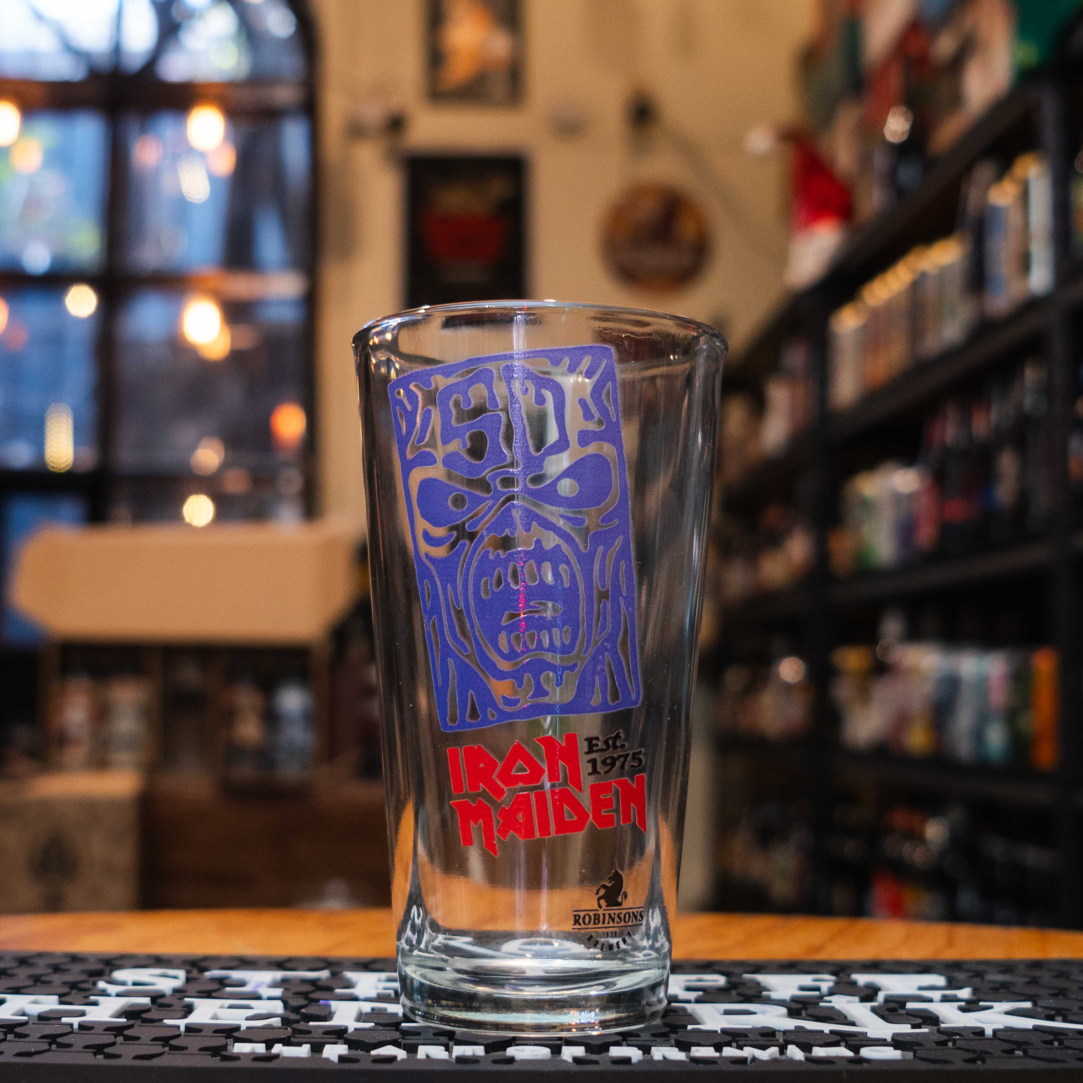 Contenido: 3 Latas de 500ml + 1 Vaso Pinta con diseño "Eddie Face" Púrpura/Azul.