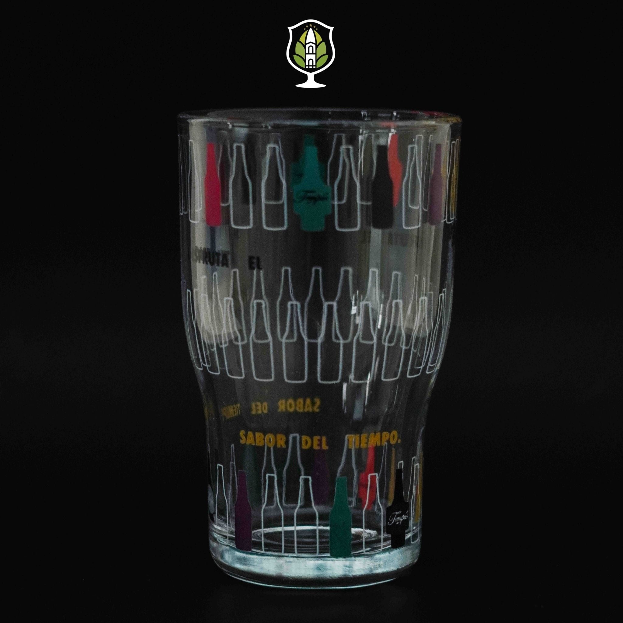 El Vaso Chelero Tempus de 350 ml es una pieza llena de identidad visual, diseñada para los verdaderos fanáticos de la cerveza artesanal mexicana. Su diseño exclusivo rompe la monotonía con un patrón dinámico de siluetas de botellas en colores rojo, verde y negro que envuelven el cristal, acompañadas del icónico eslogan "Disfruta el Sabor del Tiempo" y el sello oficial de la marca.