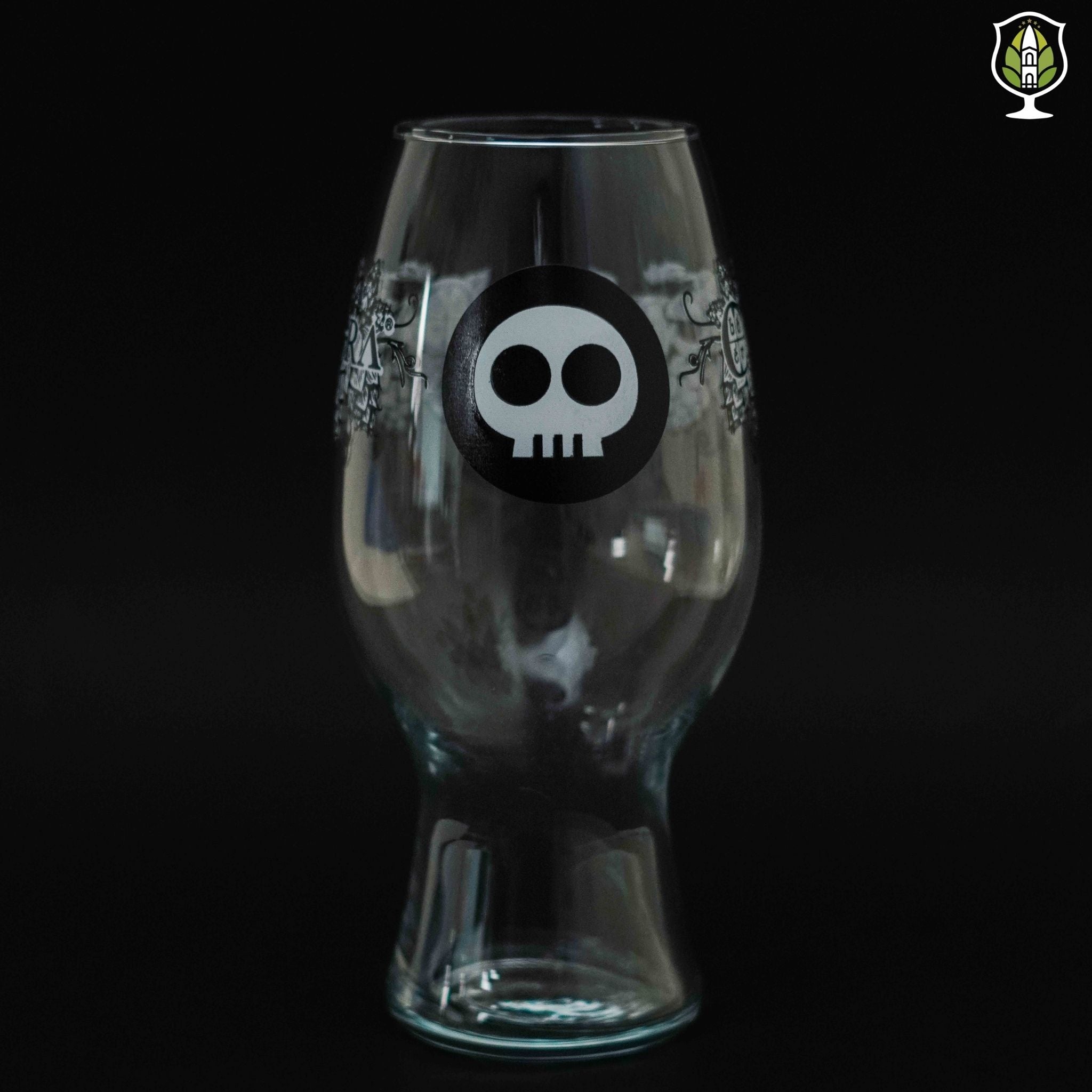 El Vaso Spigel de Cervecería Calavera es una herramienta de precisión para el aficionado a la cerveza artesanal. Con una capacidad de 350 ml, este vaso adopta la silueta técnica estilo Spiegelau, famosa por revolucionar la degustación de estilos intensos. Su diseño presenta el intrincado logotipo de Calavera rodeado de lúpulos en el frente y el icónico isotipo de la calaca en el reverso, ambos en una elegante serigrafía negra.